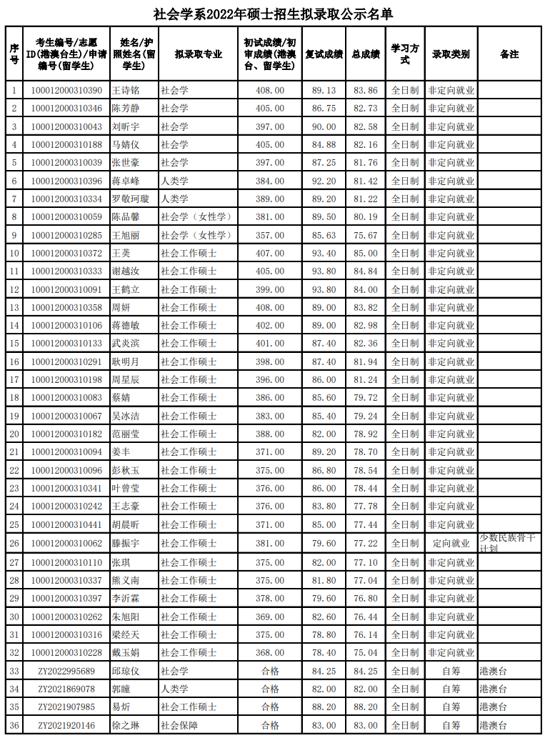 北京大学考研辅导班:北京大学社会学系2022年硕士招生拟录取公示名单