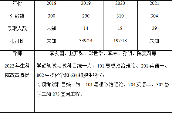 2021年华农生科院学硕的复试线为304分,微生物学进复试的共45人,通过复试的共32人,因导师名额不足院内调剂的有3人,最终微生物学专业录取29人(不包括推免生)。