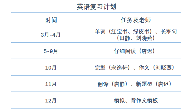 ②英语经验贴:英语其实是一个要恋爱很长期学习的科目。只要按部就班的学,把每个阶段要做的工作复习好,都不会考的太差,我本身英语很差,所以开始的比较早,在备考的3月份已经把单词记完一遍。当然,一般人的计划都是3月开始,这是正常的进度。下面图片列举了具体的复习计划以及要跟的老师,按部就班的学就没问题,最后上岸英语70+。