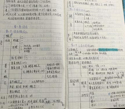 c. 后期:10-12月,我自己整理了简洁版的思维导图,就在A4纸自己画,按语音、词汇、汉字、语法四部分(汉字那节比较简单,所以我就没画)。两本书简化为几页纸,后期直接拿着纸背,把自己不会的直接标出,一目了然,而且这样可以让我们更加清楚现代汉语的脉络、层次,然后就是不断重复的背,一直到考试。Ps:导图我没有按照书上给的顺序走,而是按照自己的理解,比如词汇那节,我觉得书上给的顺序我背起来不顺,就自己改了。