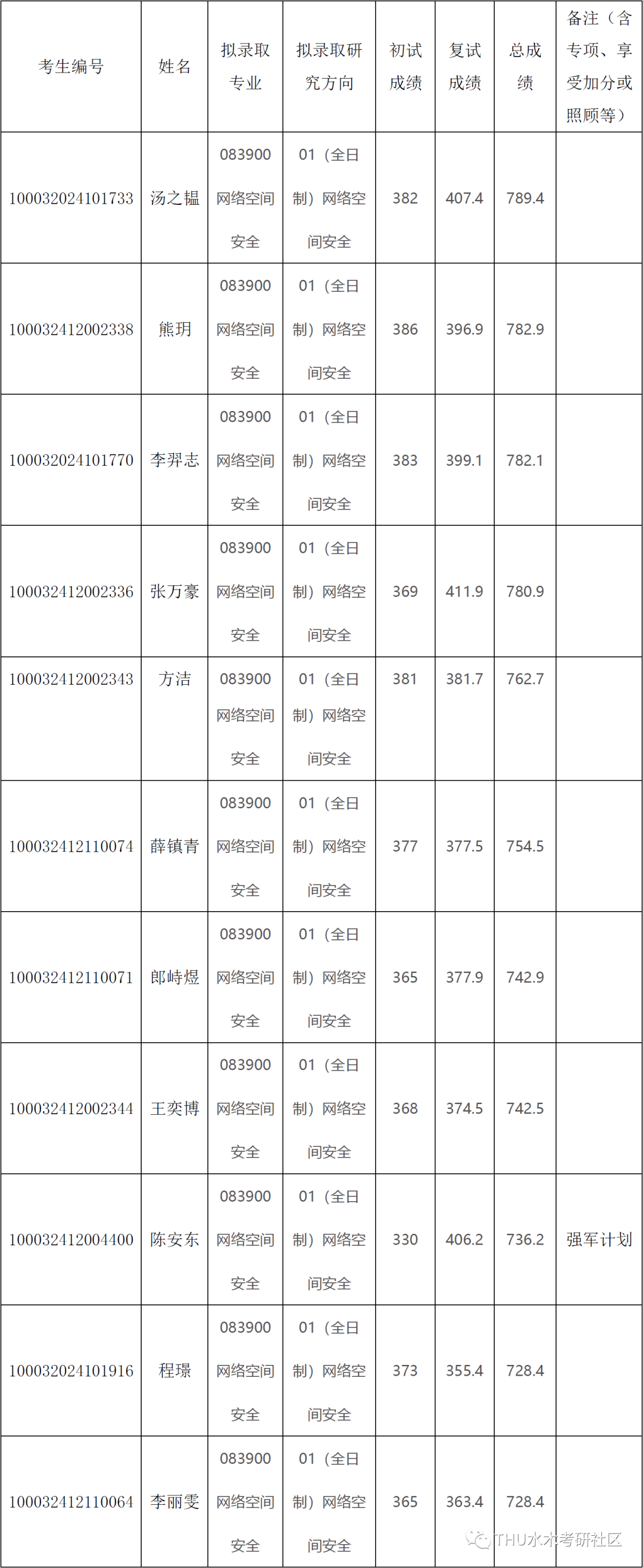 经综合考核和研究生招生工作领导小组讨论,报学校研究生招生工作领导小组批准,清华大学网络科学与网络空间研究院2022年硕士研究生拟录取名单已确定,现予以公示。