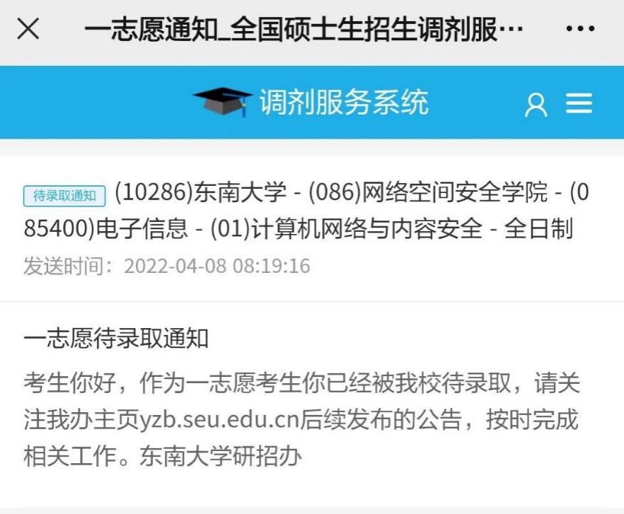 先说一下本人情况:本科双非,本科所学专业是计算机类,成绩班级中下游,经过一年的努力上岸东南大学网络安全学院电子信息计算机网络与内容安全方向。以下是录取的截图: