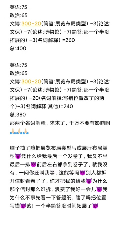 二战的时候(我一战是复试被刷了,录取最低分是374分,所以浙大文博是从21考研开始卷的,不是22考研!),五月份在慕课上听了一下浙大文博系的老师讲的博物馆和考古的课,做了一下笔记。6~8月份我在实习,所以没怎么看书。七月份到八月底,我基本每天下班之后都会看一篇博物馆的论文,看的是严建强老师的《缪斯之声 博物馆展览理论探索》这本书里面收集的论文,然后自己作总结,提炼观点,将观点改成题目,自己给自己出题,然后写答案。后续的文保复习也是这样的。九月份回家之后,刚开始的一周用来调整自己的状态,也开始慢慢背书了,但是效率不大高,而且刚回家还有各种事情,正式复习是从九月中旬开始的,学了一周之后得肾结石了,又停下来了,后面一周时间只能站着看看书,所以就看了一遍参考书目。九月底才开始复习的,但是整个九月也并不是什么都没干,至少我把一战用过的复习资料,还有实习期间自己总结的东西全都过了一遍。10月1号到12号又把这些东西都过了一遍,在这期间,重新分析了一遍真题。13~18号做了思维导图,每个版块都做了思维导图(我的思维导图是框架式的,并没有很细),10.20~11月5号照着思维过了一遍资料,真的很难!因为我之前都是先看一遍答案,划一下关键词,然后自己复述,基本很快就能记住了。用思维导图背书,就是一个题目,一个框架,几个关键词,其他的都要自己联想,所以这轮背诵对我来说真的很难,差点放弃这种方法了,但是坚持下来之后,在下一轮的时候就很轻松了,有逻辑、有框架、有关键词,真的很好记!强推思维导图,一定要做!!!然后这种复习方法一直持续到考前三天,在这期间,我每次背累了的时候都会停下来看论文,自己给自己出题,然后总结答案,这种方法也很棒,因为不管是答真题还是自己出的题目,都能锻炼自己的答题思维,这样才能做到会答题。最后三天我把所有的复习资料看了一看,然后就上考场了,最后专业课还挺高的,但其实我专业课在考场上又出状况了,不然还能更好!这是我考完自己分析了一下题目,给自己的估分情况以及自己的目标分数: