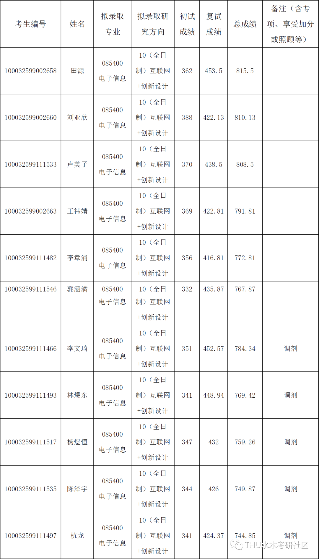 经综合考核和研究生招工作领导小组讨论,报学校研究生招生工作领导小组批准,清华大学深圳国际研究生院2022年硕士研究生电子信息(互联网+创新设计)项目拟录取名单已确定,现予以公示 。
