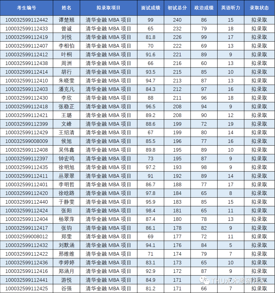 经综合考核和研究生招生工作领导小组讨论,报学校研究生招生工作领导小组批准,清华大学深圳国际研究生院2022年硕士研究生工商管理专业(非全日制清华金融MBA 项目)拟录取名单已确定,现予以公示。