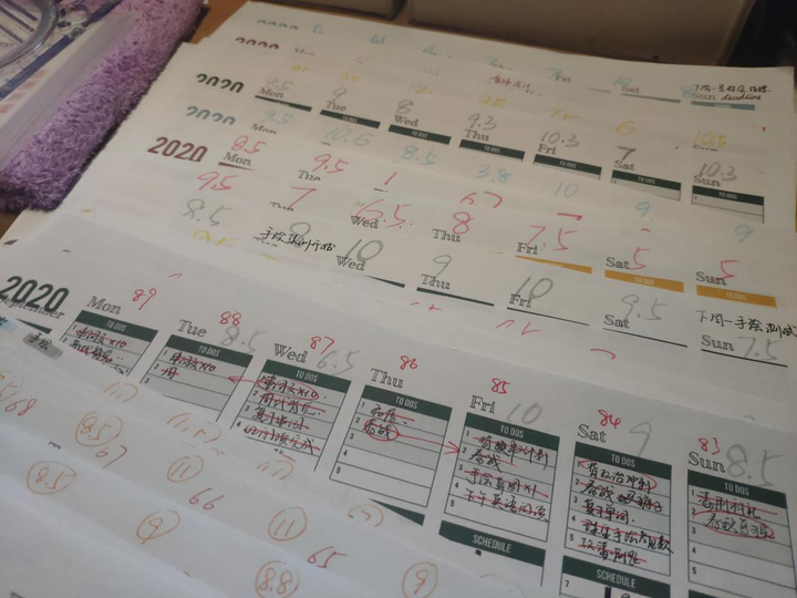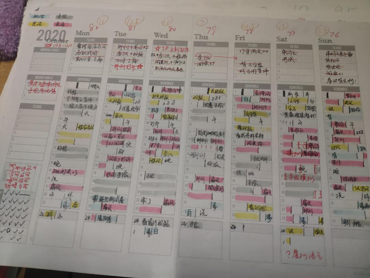 后期用4色荧光笔分别代表4个学科的学习时间,合理安排各科的时间分配。这个方法我一直延续到现在,也买了《子弹笔记》这本书,来帮助管理生活,不过没有考研时候那么强迫自己了。