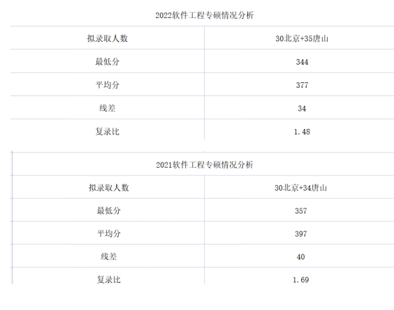 上图软件工程拟录取名单数据分析,复录比为1.48,相对于21年的复录比有所降低。2022年进入复试的最高分416,最低分343,平均分371,相对于21年有所降低,并且2022年的拟录取人数相对于21年,增加了1个唐山名额,从分数下差额可以看出,基本上要超复试线40分,是比较稳的,其他同学在复试的过程中要继续努力。