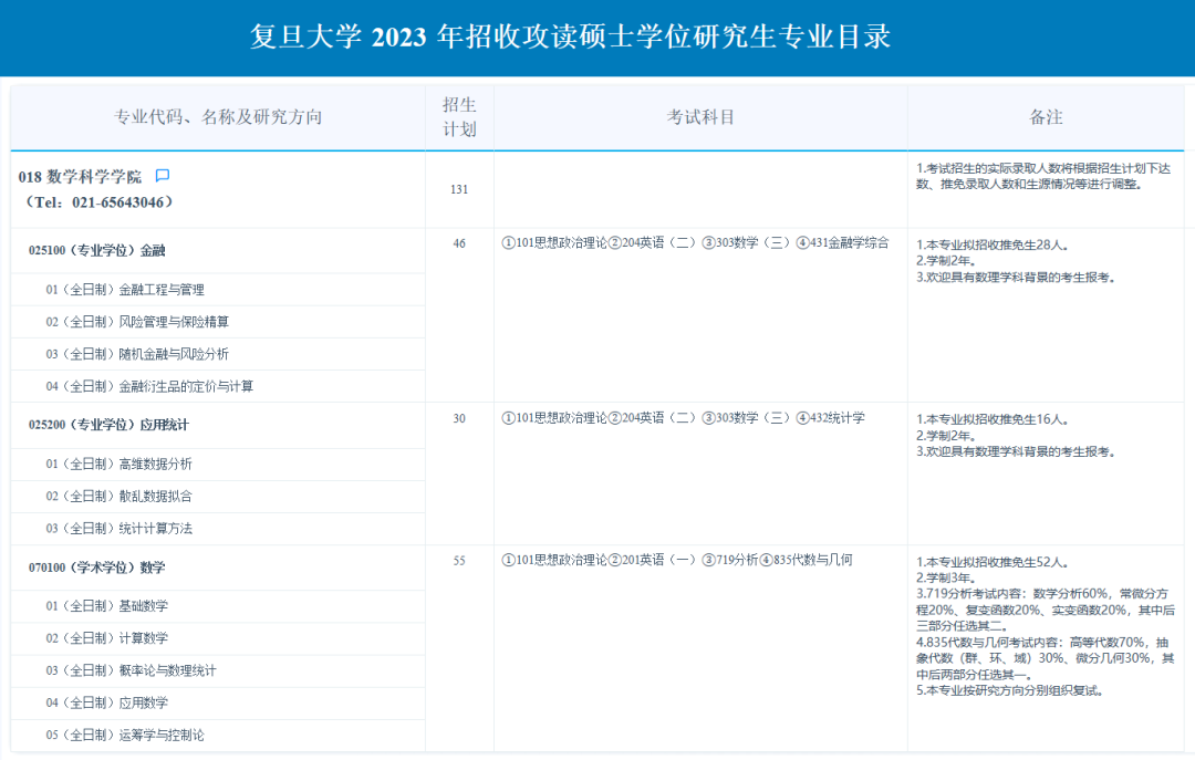 2023年复旦大学数学科学学院硕士研究生专业目录