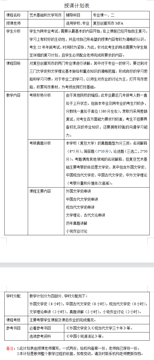 新祥旭考研一对一:2023年复旦大学创意写作专业考研一对一辅导授课计划