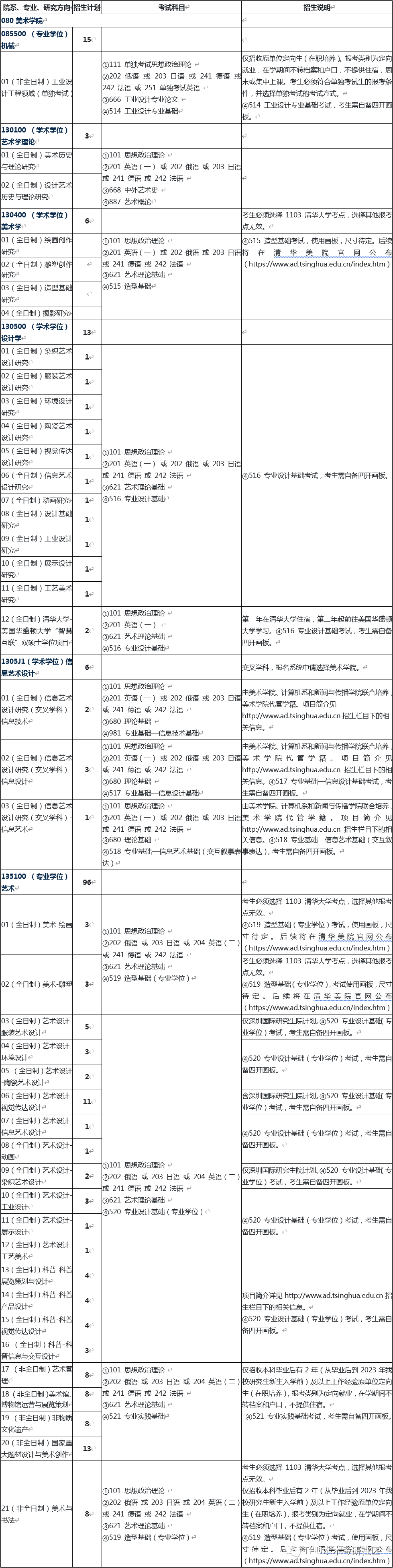 2023年清华大学美术学院硕士研究生招生专业目录、招生人数
