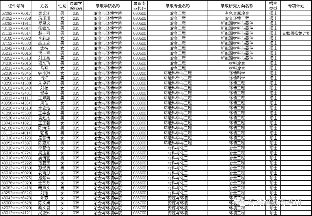 2023年中南大学冶金与环境学院拟录取推荐免试研究生名单公示