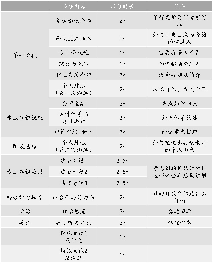 本课程针对北京大学光华管理学院审计专业复试,分别从专业能力和综合能力培养设计课程内容,涉及复试能力概述,会计、审计专业课程,资本市场热点分析,个人职业发展及规划等问题,同时补充政治和英语课程,为复试做出全方位的培训和准备。