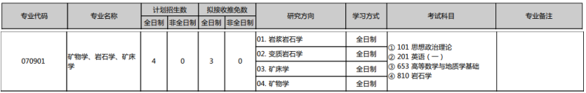 科目:① 101 思想政治理论② 201英语一③ 653高等数学与地质学基础④ 810岩石学.
