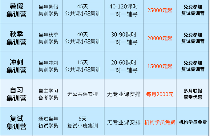 第一教学的针对性强。新祥旭考研集训营是全日制、军事化、封闭式的考研辅导班。第二学习环境和氛围好。新祥旭集训营的学习环境和氛围非常类似于高三时期的住宿式学习。大学校园环境,回归高三式教学全日制住宿式管理,以保障好的学习环境和氛围。第三学习时间集中也相对长,有利于学生吸收消化知识。传统的考研辅导班多采用短期的走读式教学,学生来辅导班复习主要是进行短期突击,老师一般上完课就走人,不存在辅导效果监督的问题。而新祥旭集训营教学辅导时间一般是覆盖全年,学习上课的时间针对不同学科进行分配,如上午是数学,下午可能是英语,明天又可能是政治,学生有充分的吸收消化的时间。第四小班制教学,注重个性化。以前的考研辅导班都是动辄上千人的大班,学习效果如何,无人督促监督。以新祥旭考研集训营为例,均实行小班授课,采用五轮四阶一体化教学,且有专门的教务老师和班主任负责日常学习及生活管理,教学上采取“讲、练、评、模”一体化跟踪教学,细致照顾到每一位同学。第五点定向辅导。可以学生的报考专业、院校分班,同时根据各个院校的实际考试情况,来判断学生的实际报考能力,进而加以优化辅导计划。目前只有有实力的辅导机构才能做到这样。