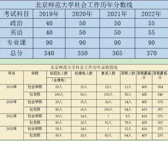 学弟学妹们好,我是22级考研,一战上岸北京师范大学社会工作专业。我考研一方面是提升学历,增加自身竞争力;另一方面是读研两年的性价比要比工作两年高很多。北京师范大学是教育部直属985,也是第一批民政部社工人才培养基地,学校和专业都名列前茅,招生人数除去推免有六十多人,再加上题目范围比较固定,学制两年,因此性价比很高。这两张表汇总了这几年的分数线和录取情况,大家可以参考。社会发展与公共政策学院都有招社会工作硕士,社发院招生人数比社会学院多很多,社发院在珠海培养,社会学院在北京培养,两学院考题一致。