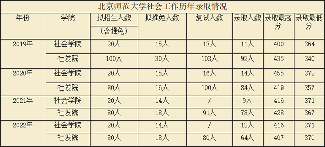 学弟学妹们好,我是22级考研,一战上岸北京师范大学社会工作专业。我考研一方面是提升学历,增加自身竞争力;另一方面是读研两年的性价比要比工作两年高很多。北京师范大学是教育部直属985,也是第一批民政部社工人才培养基地,学校和专业都名列前茅,招生人数除去推免有六十多人,再加上题目范围比较固定,学制两年,因此性价比很高。这两张表汇总了这几年的分数线和录取情况,大家可以参考。社会发展与公共政策学院都有招社会工作硕士,社发院招生人数比社会学院多很多,社发院在珠海培养,社会学院在北京培养,两学院考题一致。