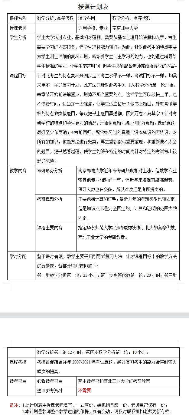 新祥旭考研: 南京邮电大学数分高代授课计划参考