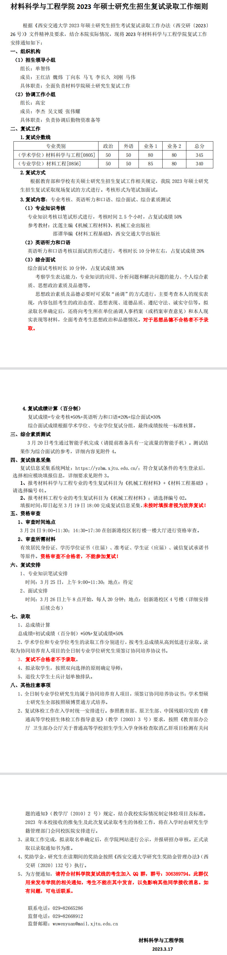 西交堂考研:2023年西安交通大学材料科学与工程学院硕士研究生复试细则