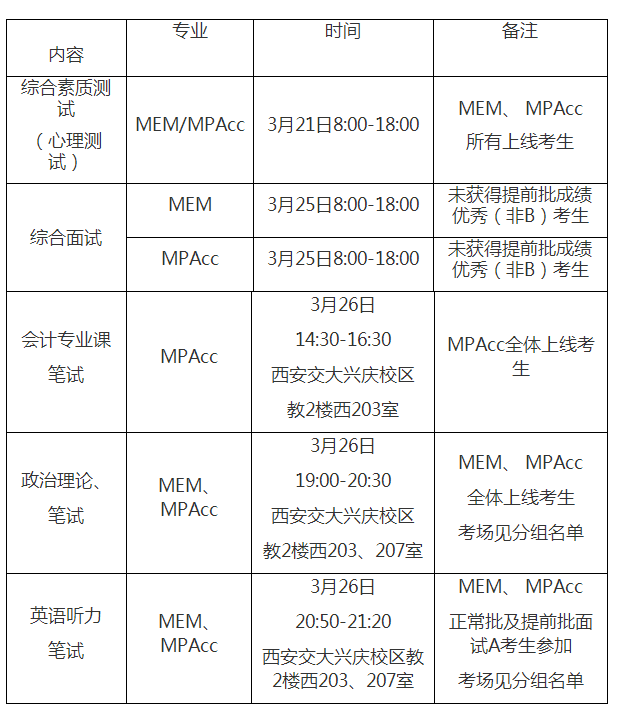 根据《西安交通大学2023年硕士研究生招生考试复试录取工作办法(西交研〔2023〕26号)》文件精神及要求,结合本院实际情况,现将2023年管理学院非全日制工程管理硕士(MEM)、会计硕士(MPAcc)复试工作安排如下: