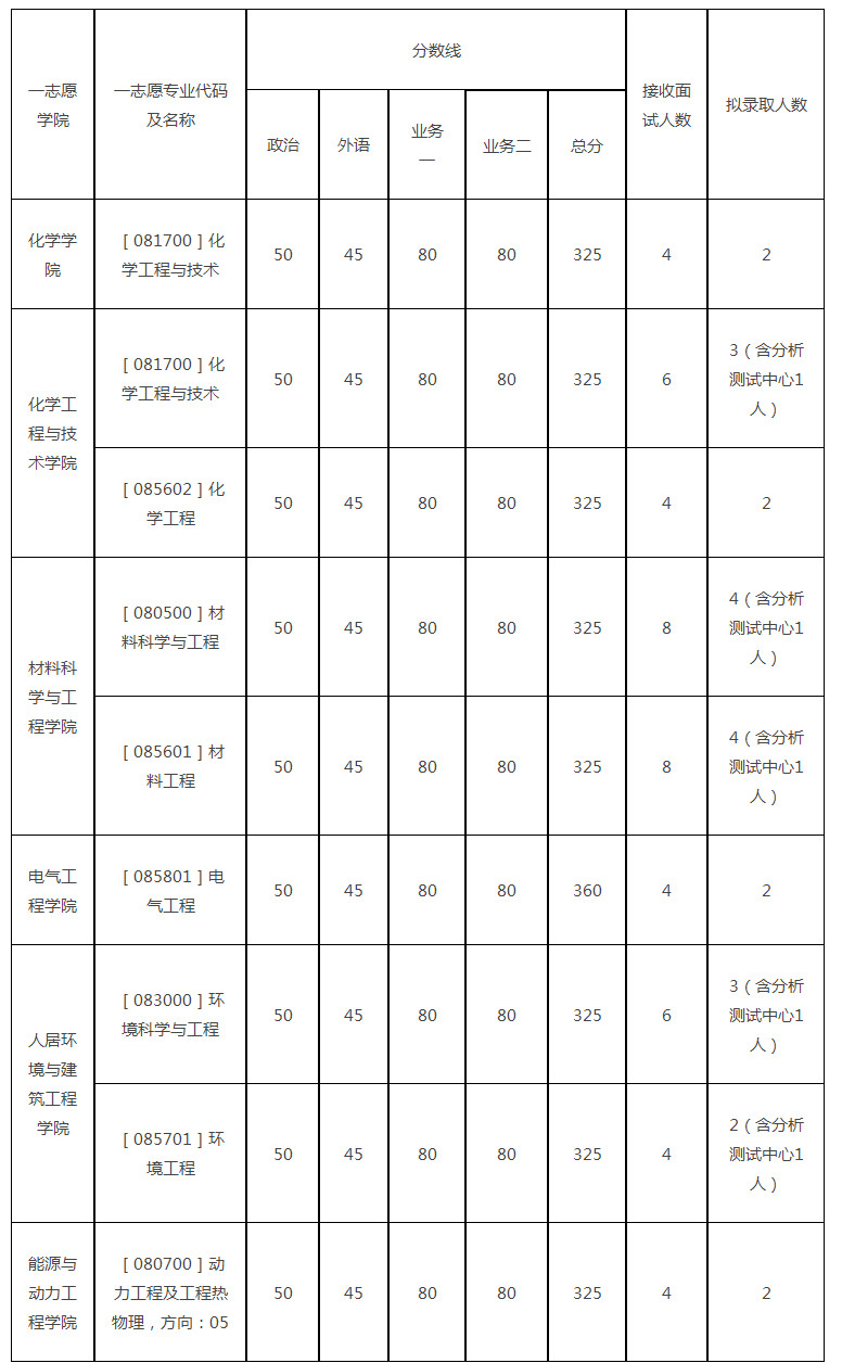 6.申请调剂分析测试中心的考生,须选择孟令杰、张杨、周国庆三位导师,单独组织复试,单独排名,单独录取。该专项指标仅接受化学工程与技术学院[081700]、[085602],材料科学与工程学院[080500]、[085601],人居环境与建筑工程学院[083000]、[085701]专业。