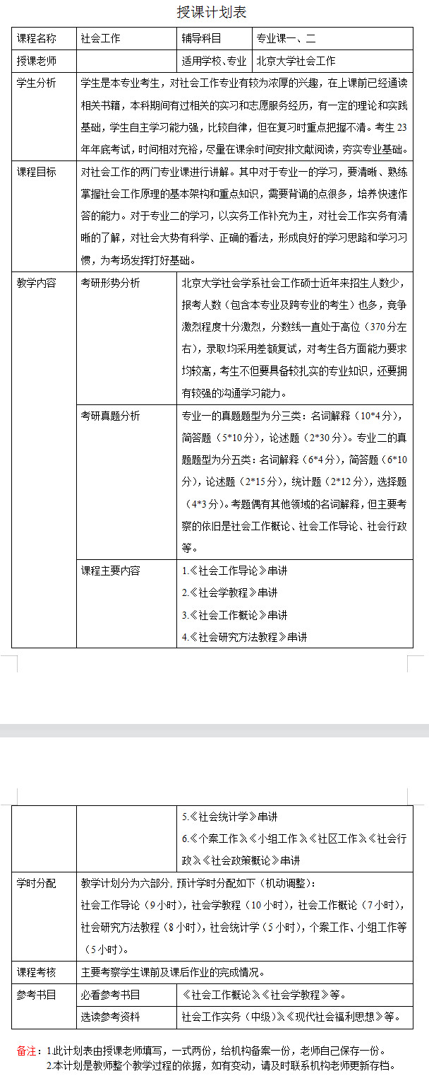 新祥旭考研:2024年北京大学社会工作专业考研一对一辅导授课计划