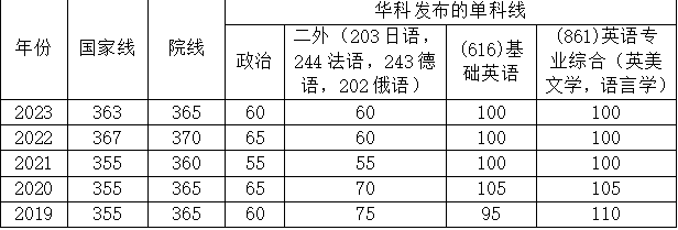 华科是自划线院校,所以考生的初试分数不仅总分要过院线,每个科目还要过学院划定的单科线,方能进入复试。近五年外国语言学及应用语言学/英语语言文学专业(学硕)的分数线: