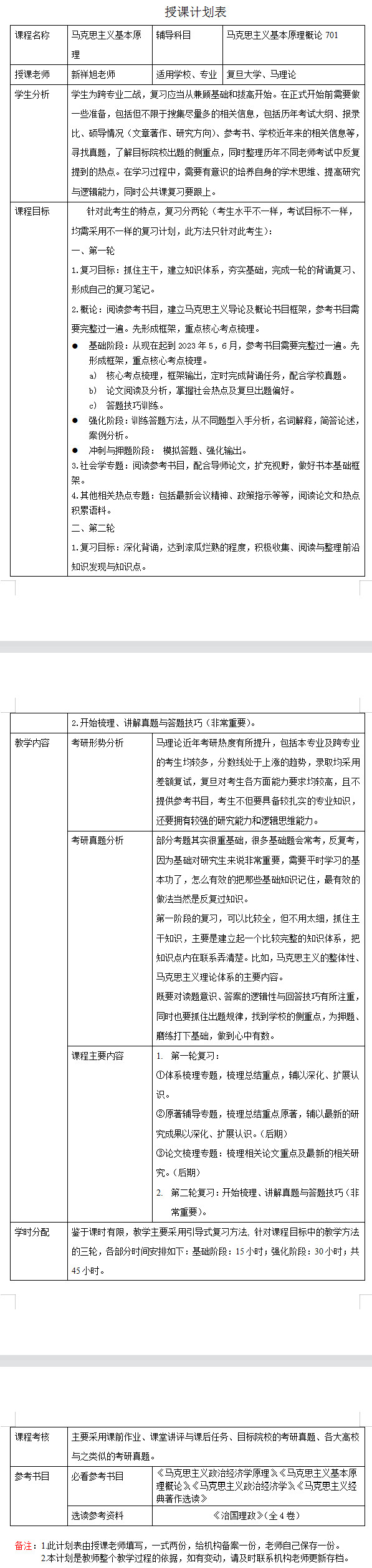 新祥旭考研:2024年复旦大学马克思专业考研一对一辅导授课计划