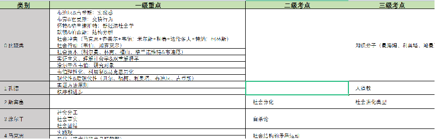 九月底我确定了以人大为目标学校,对西方社会学的一轮学习也结束了,因此后续的二轮复习是以复述思想家的理论+看真题+其他题库练习题为策略的,具体做法是我按照理论的复杂程度确定了复习时长(例如舒茨的理论我一般一天结束,但是帕森斯的我会花三天时间),同时按照流派(功能论、冲突论等)对23位思想家做了分类,一个专题一个专题的去复习理论。这个阶段我一方面完成了理论的背诵(不需要逐字逐句,以框架完整、内容核心正确为目标),并且眼熟了大部分题目的考察方法和真题偏好,整理了如下的表格,为后续三轮做好了准备。