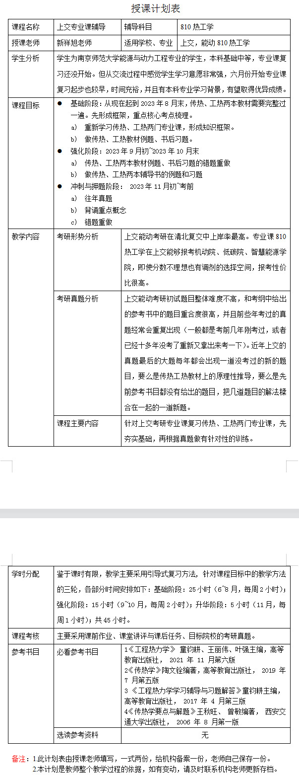 新祥旭考研:2024年上海交通大学能源动力专业810热工学考研一对一辅导授课计划