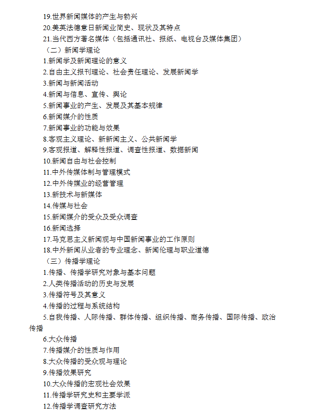这几本书里对于新闻学而言必须要掌握的是《新闻学概论》、《传播学教程》和《新闻事业发展史》尤其是新闻学和传播学这两本书必须要背到滚瓜烂熟,这两本书要最少背五遍。我相当于背了两年书,因此第二年后期的时候可以十几分钟过完一本书,到后期(约11月、12月)可以做到看一眼章节标题然后直接回顾这一章的所有知识点,如果碰到不熟的知识点我就再回去背诵。