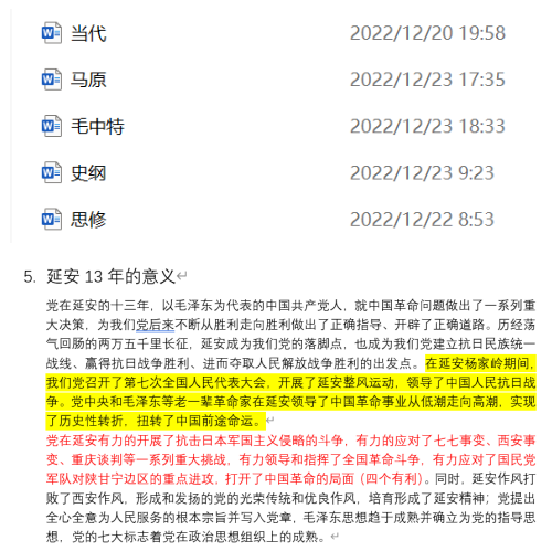 对于论述题而言,我跟大多数人一样,都是等到12月份肖四和腿姐最后冲刺课出来的时候才开始正式背书的。我的背书步骤是:将肖四和腿四所押的有重合性的题目按学科分别整理→每一道题的答案都是肖四和腿四的参考答案综合加总,并结合腿姐最后9页纸补充(如后图所示)→将腿四和肖四的零星题目补充入内→形成5门学科(马原、近代史、毛中特、思修和世界时事)的5个word文档