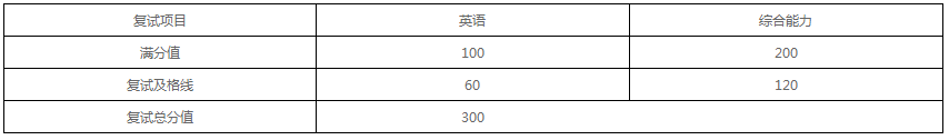 复试满分值为300分,180分(不含)以下为不及格,复试成绩不及格为复试不合格。英语低于60分或综合能力面试低于120分为复试不合格。