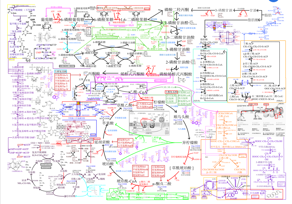 7. 完成循环网络图的绘制。这个循环网络图实际上就是生化部分中的动态生化部分,加上分子过程DNA复制,RNA转录,蛋白质翻译部分。同学们需要在学习过程中,逐步学会自己徒手绘制各种循环图包括糖酵解,三羧酸循环,以及各种循环,并将他们连接在一起。这几张图的内容和之前《其他部分》的图,可以概括《生物化学》70%的内容。这是一个把书读薄的过程。这个循环图是你依照你自己的理解记忆,逐步手绘出来的。同学们不要觉得不可能,这个是你按照我的方法来,一定会做到的,也一定要做到。很多人在学习生化的时候,会出现忘记和混乱的情况,这个时候,你就需要有组织性的知识网络帮你记忆,所以这个知识网络图非常重要。这个图也是你复习的最重要的材料之一!