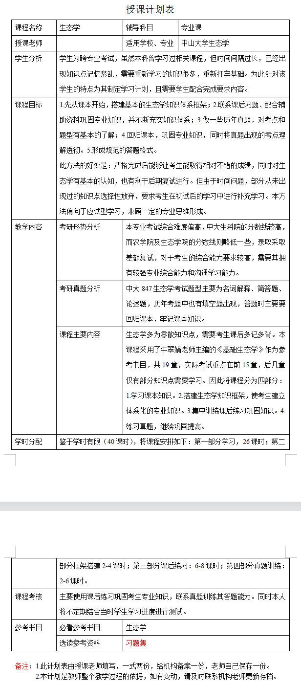 新祥旭考研:2024年中山大学生态学专业考研一对一辅导授课计划