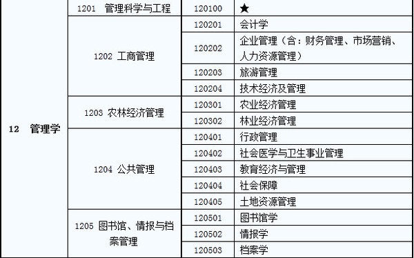 研究生教育十三个学科门类中,管理类是一个大家族。一共有五个一级学科十五个二级学科(专业)。其中1201管理科学与工程不划分二级学科。其他四类学科都各有好几个专业。以下是研招网最新的学科专业划分示意图。