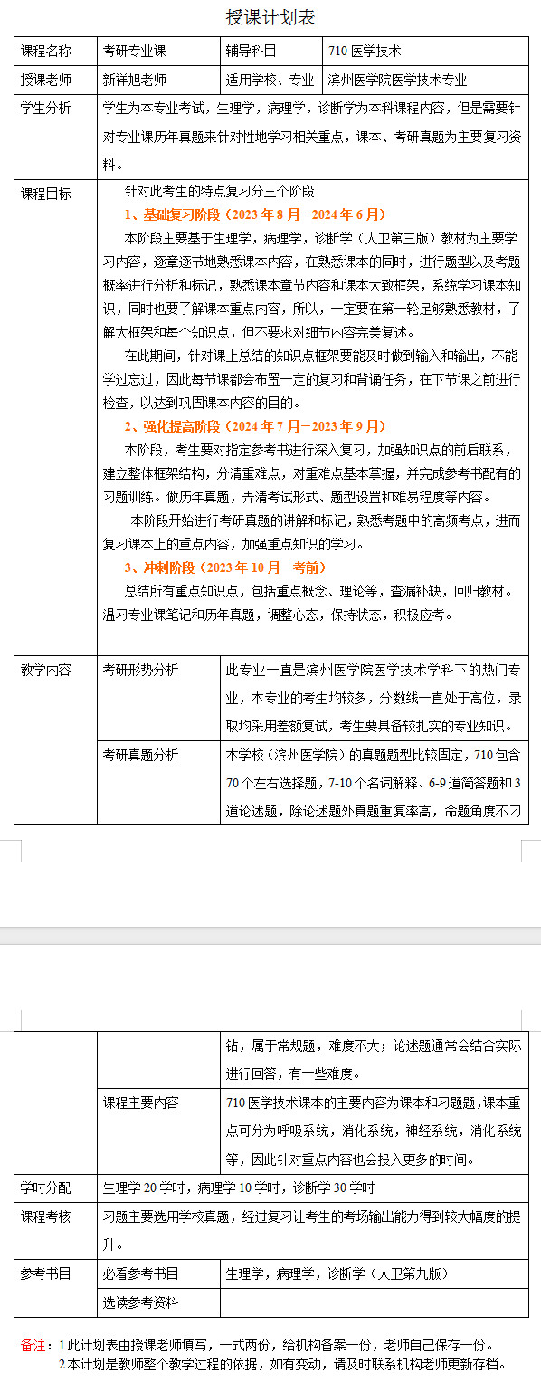 新祥旭考研:2024年滨州医学院医学技术专业考研一对一辅导授课计划
