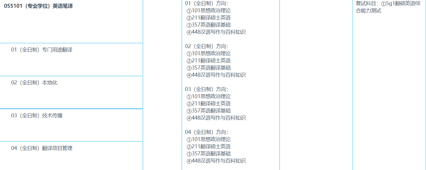 英语笔译专硕分为四个方向,第一个是本地化方向,第二个方向是专门用途翻译,第三个方向是技术传播,第四个方向是翻译项目管理,但在实际授课中并不区分方向,所有的学生都会接受这四个方向的科目授课。