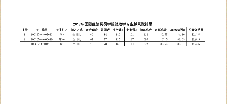 2017年对外经济贸易大学财政学研究生拟录取名单