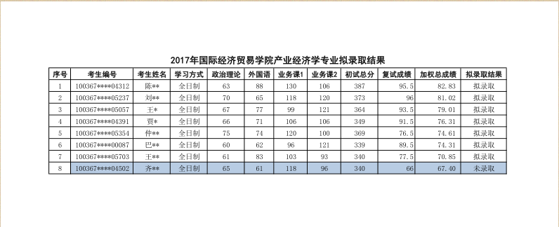 2017年对外经济贸易大学产业经济学(国贸院)研究生拟录取名单