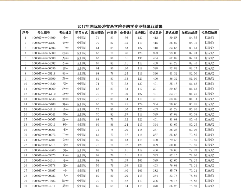2017年对外经济贸易大学国贸院金融学专业研究生拟录取名单