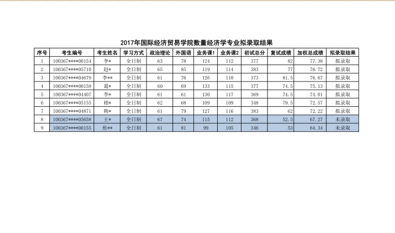 2017年对外经济贸易大学数量经济学专业研究生拟录取名单