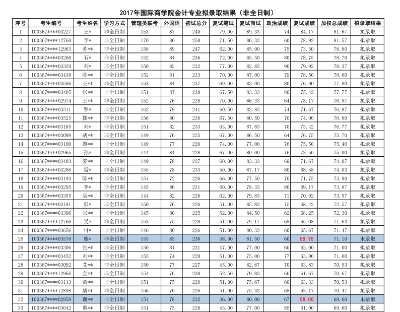 2017年对外经济贸易大学会计硕士(非全日制)研究生拟录取名单