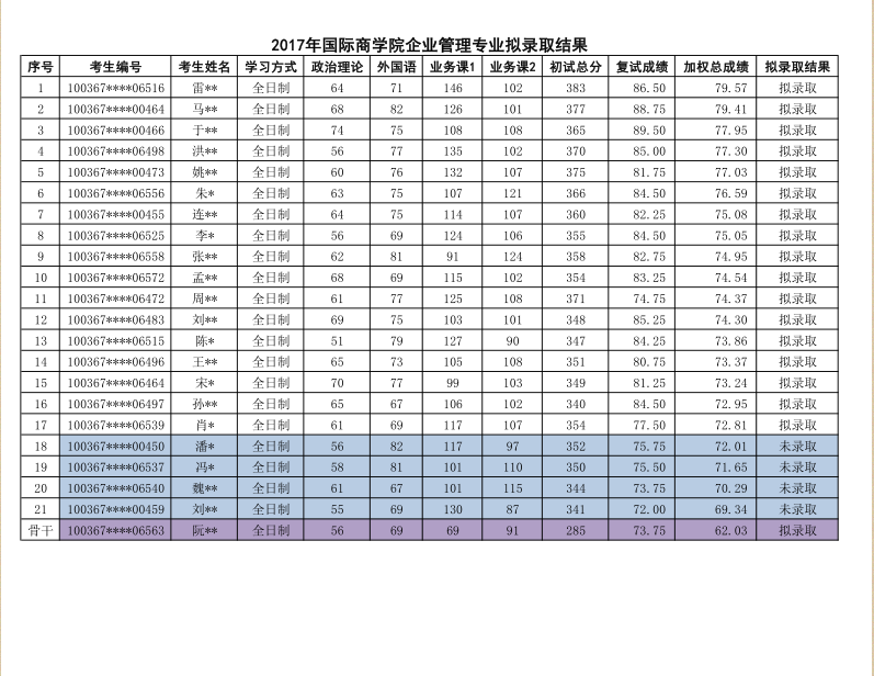 2017年对外经济贸易大学企业管理研究生拟录取名单