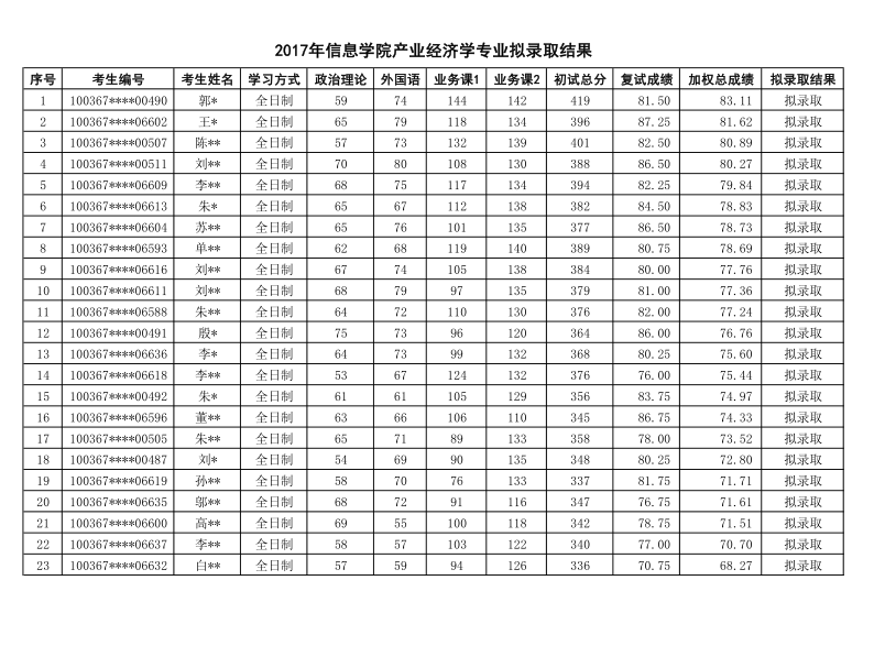 2017年对外经济贸易大学信院产业经济学研究生拟录取名单