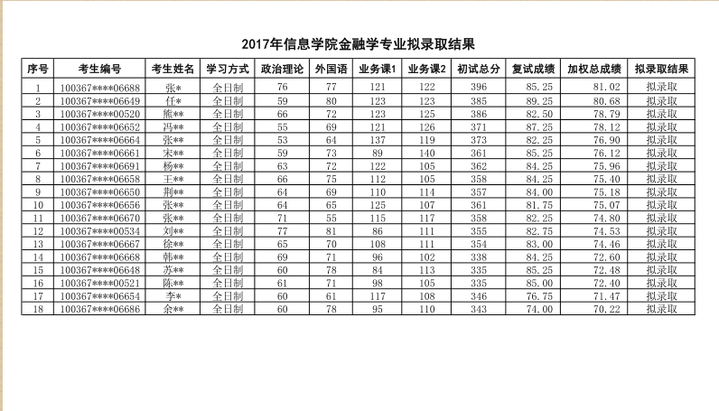 2017年对外经济贸易大学信院金融学研究生拟录取名单