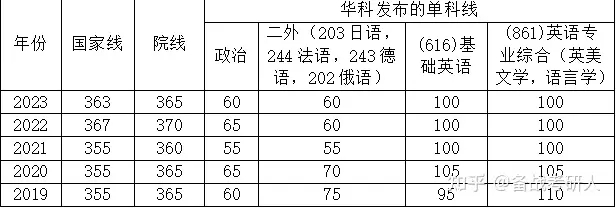 华科是自划线院校,所以考生的初试分数不仅总分要过院线,每个科目还要过学院划定的单科线,方能进入复试。近五年外国语言学及应用语言学/英语语言文学专业(学硕)的分数线: