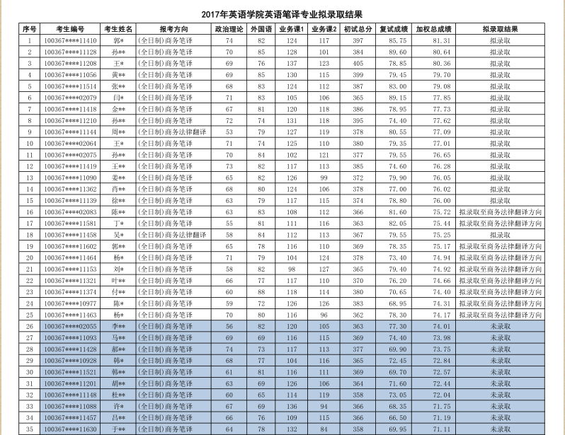 2017年对外经济贸易大学英语笔译研究生拟录取名单