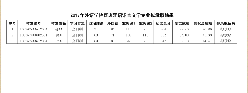 2017年对外经济贸易大学西班牙语语言文学研究生拟录取名单