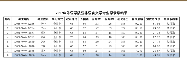 2017年对外经济贸易大学亚非语言文学研究生拟录取名单