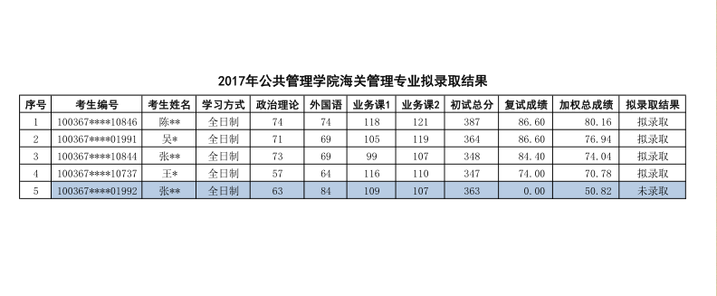 2017年对外经济贸易大学海关管理研究生拟录取名单